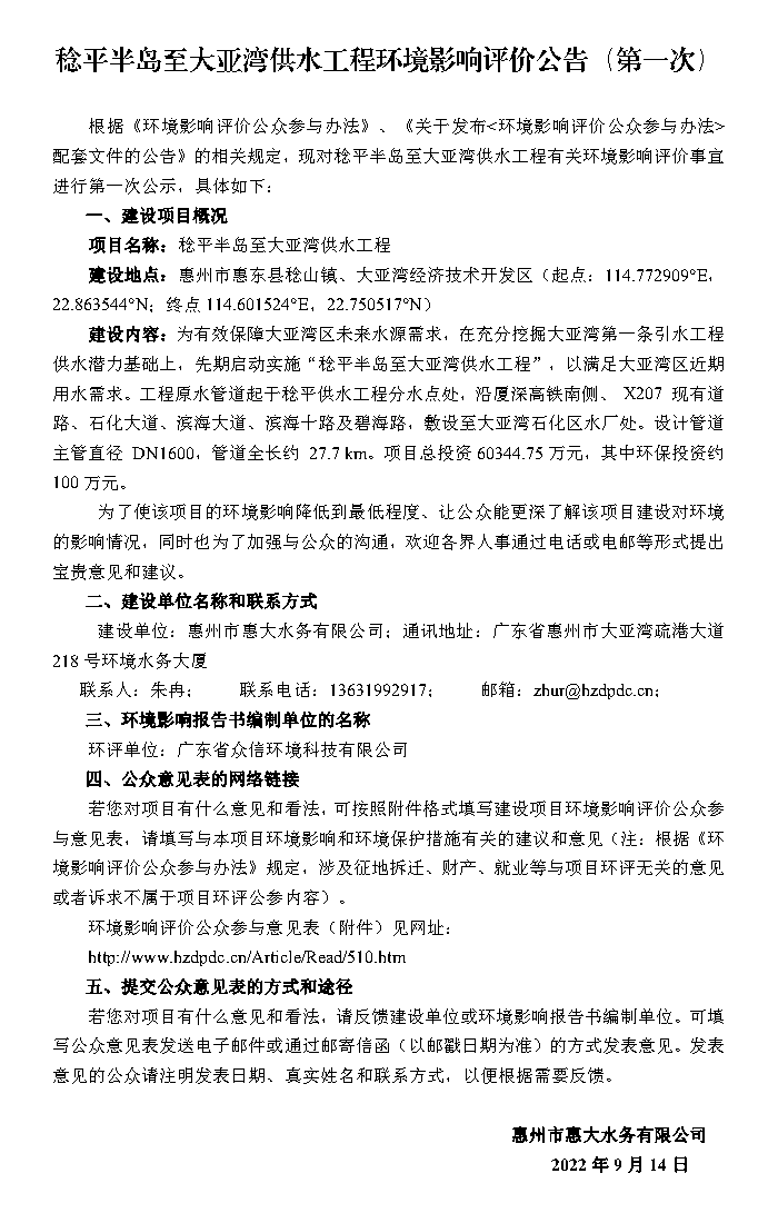 稔平半島至大亞灣供水工程環境影響評價公告(第一次)