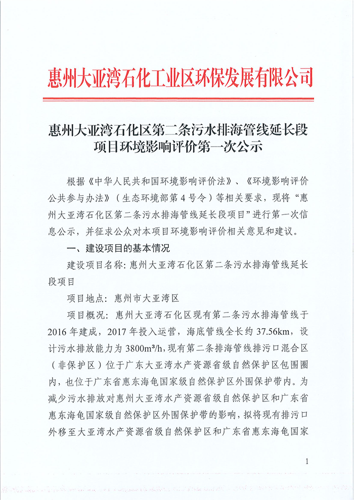 惠州大亞灣石化區(qū)第二條污水排海管線延長段項目環(huán)境影響評價第一次公示